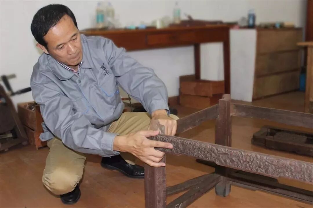 △南京博物院古典文物家具总指导及修复师倪建平正在修复古文物家具